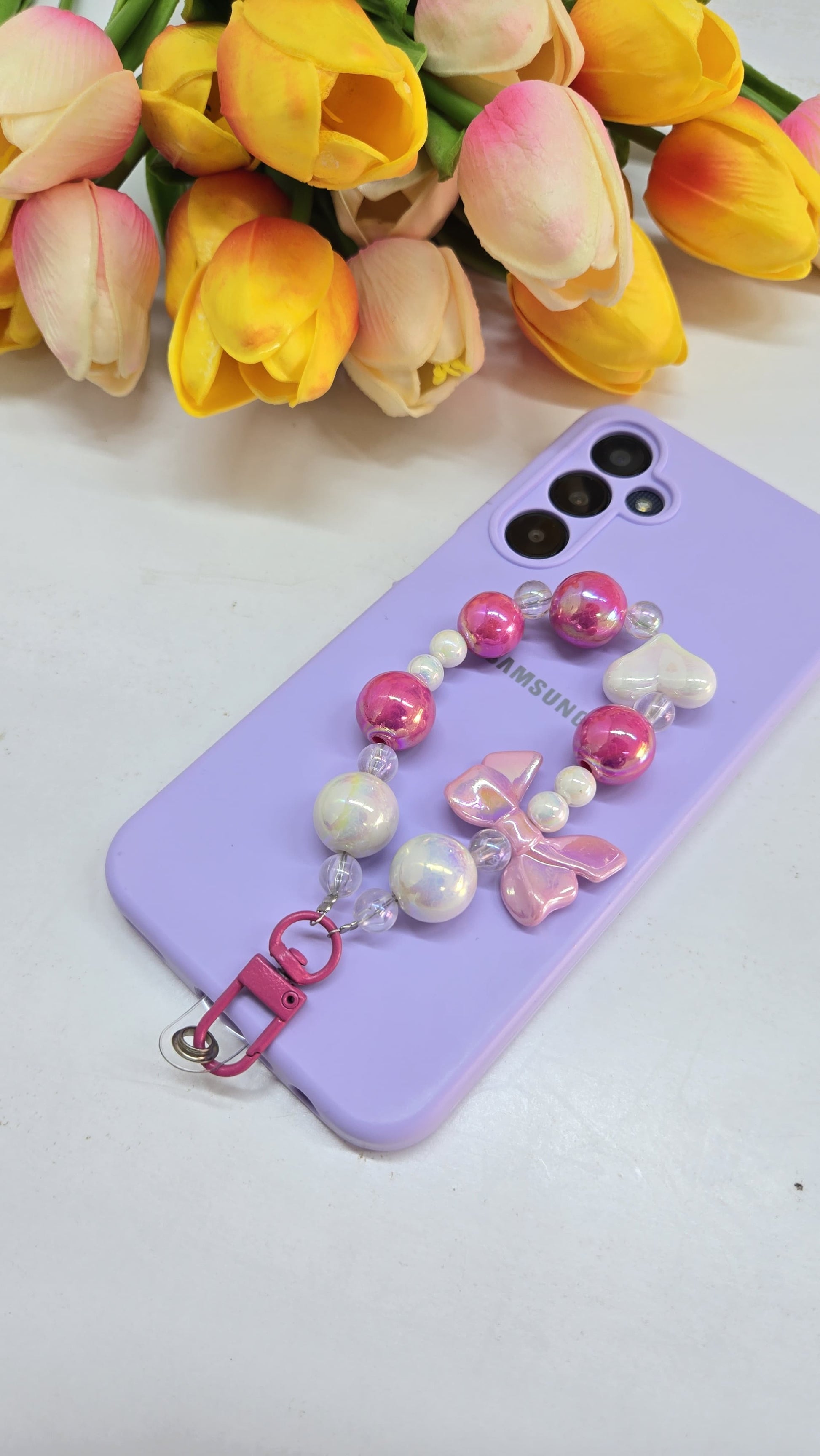 Add a touch of sweet personality to your everyday tech with this adorable pastel phone charm. Combining cute bows, iridescent beads, and practical functionality, it turns your phone into a fashion accessory that's as fun as it is useful.