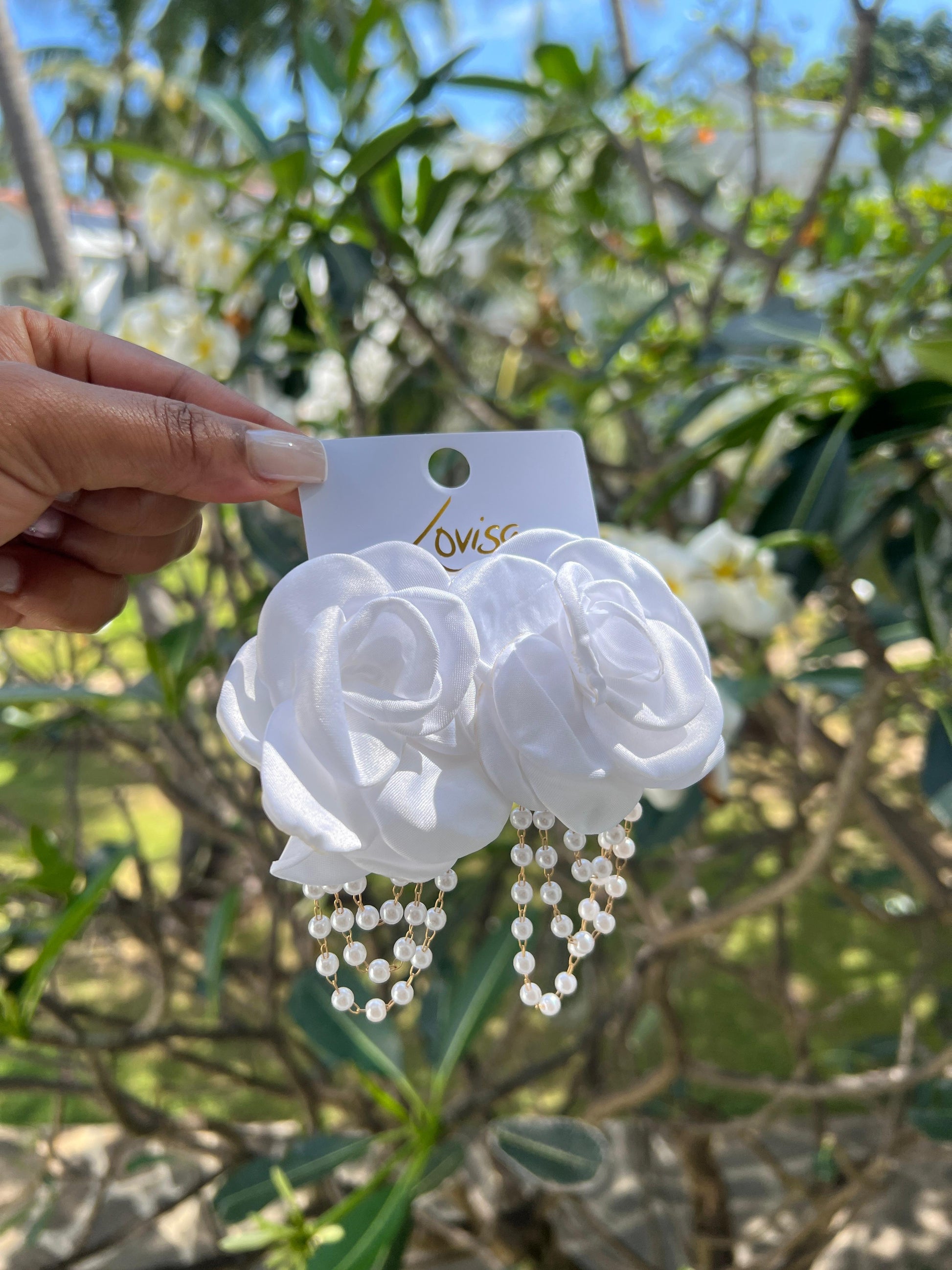 Capture the essence of romantic elegance with these exquisite drop earrings. Featuring delicate white fabric roses and cascading pearl strands, they bring ethereal beauty and graceful movement to your most cherished moments.